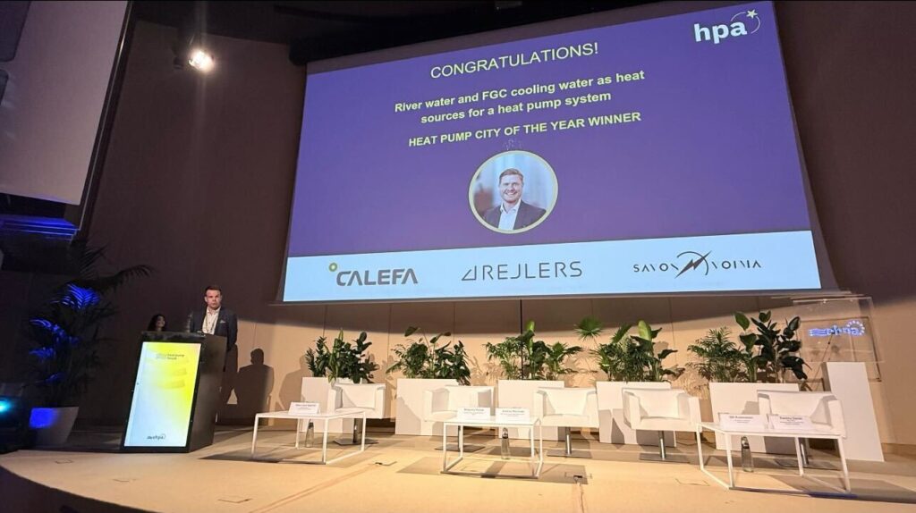 The award ceremony organized the 23rd of September by Euroepan Heat Pump Association in Brussels, recognizing pioneering heat pump implementations from across Europe. This marks the third time a Calefa project has been honored at the annual awards gala. In 2021 an AmbiHeat Heat Pump plant for Orion Oyj’s Turku medical plant won the DecarbIndustry Award, and in 2015 a solution recycling datacenter waste heat to district heat in Mäntsälä won the Heat Pump City of the Year Award.
